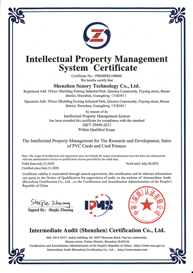 As a collection of R&D, production, sales for the integration of high-tech enterprises, Seaory will establish patent protection as the core, supported by trademark and trade secret protection of intellectual property rights structure, the use of intellectual property to enhance core competitiveness, promote the sustained and healthy development of the company, strive to become the backbone to lead the global card printer market.