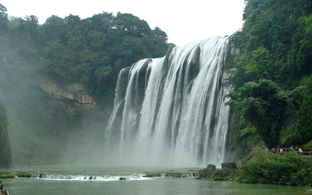 Huangguoshu Waterfall - Asia's largest waterfall, China's largest waterfall, five A scenic spots, walking at the plank road to this spot, mountains around and with wonderful tree shadows. The sky is blue and cloud is white, the ground is crowded, you can hear far away the stream is singing .